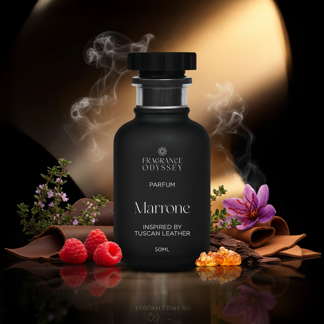 Marrone is an ode to bold sophistication — rich, warm, and deeply textured. It opens with striking notes of raspberry and saffron, layered over aromatic thyme, creating an intriguing sweetness against spice. At its heart, smooth leather and smoky olibanum (frankincense) emerge, adding depth and character. Finally, amberwood and suede anchor the scent with warmth and refined earthiness.